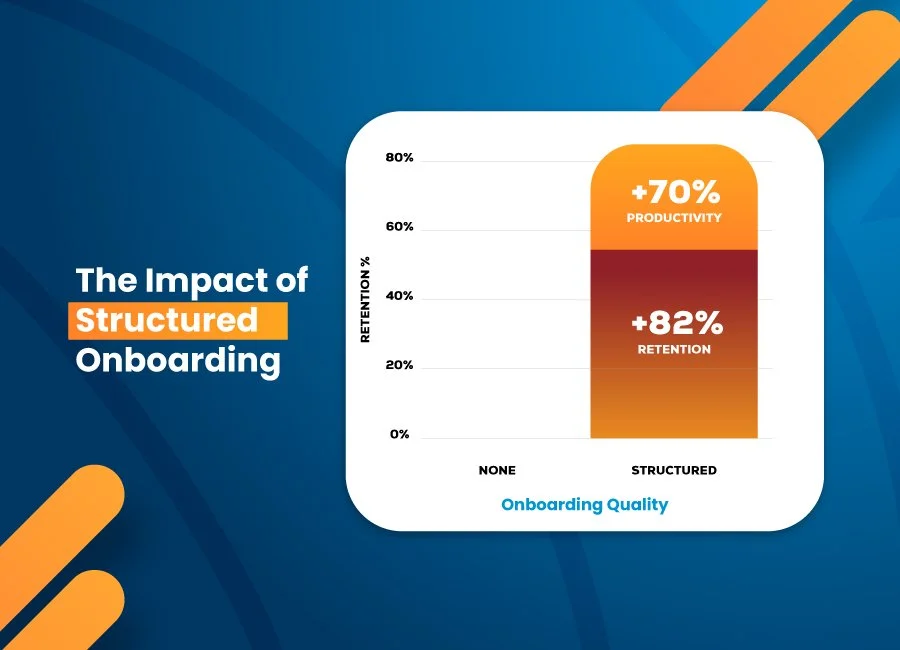 Bar chart comparing structured vs unstructured onboarding showing 82% increase in employee retention and 70% boost in productivity with structured onboarding programs
