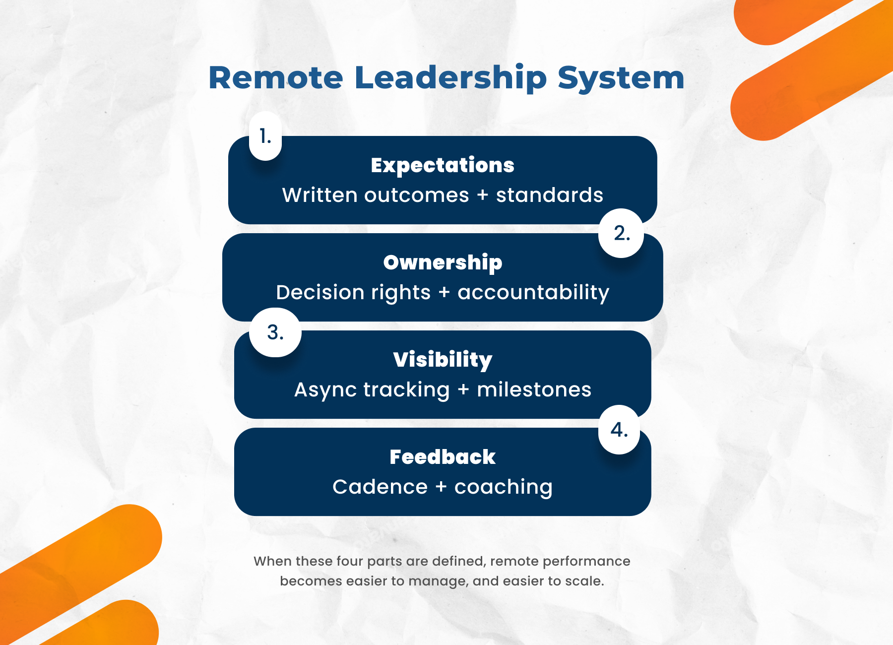 Clear expectations, defined ownership, trust-building consistency, asynchronous performance visibility, and structured onboarding leadership.