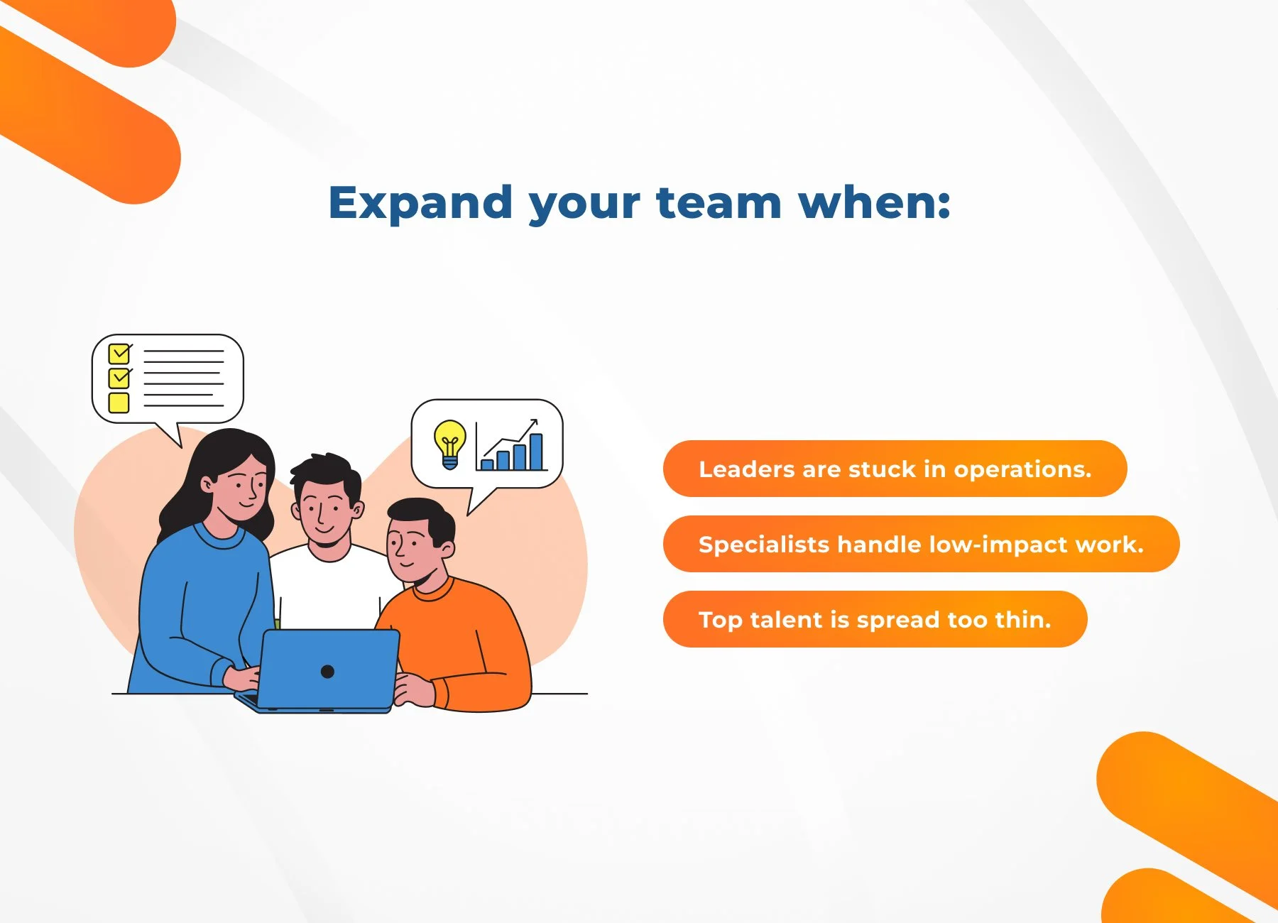 A heavier workload on its own is not the signal. The stronger signal is when execution starts to suffer. If deliverables are slipping, timelines are stretching, or your team is spending more time coordinating than completing, the business is no longer absorbing demand efficiently.