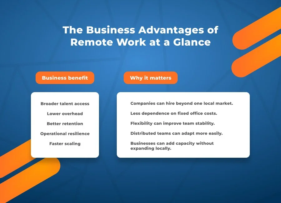 Remote work is often framed as a cultural shift, but the business case is operational. Fewer fixed office costs, more flexible workforce planning, and better allocation of budget all improve how companies scale.